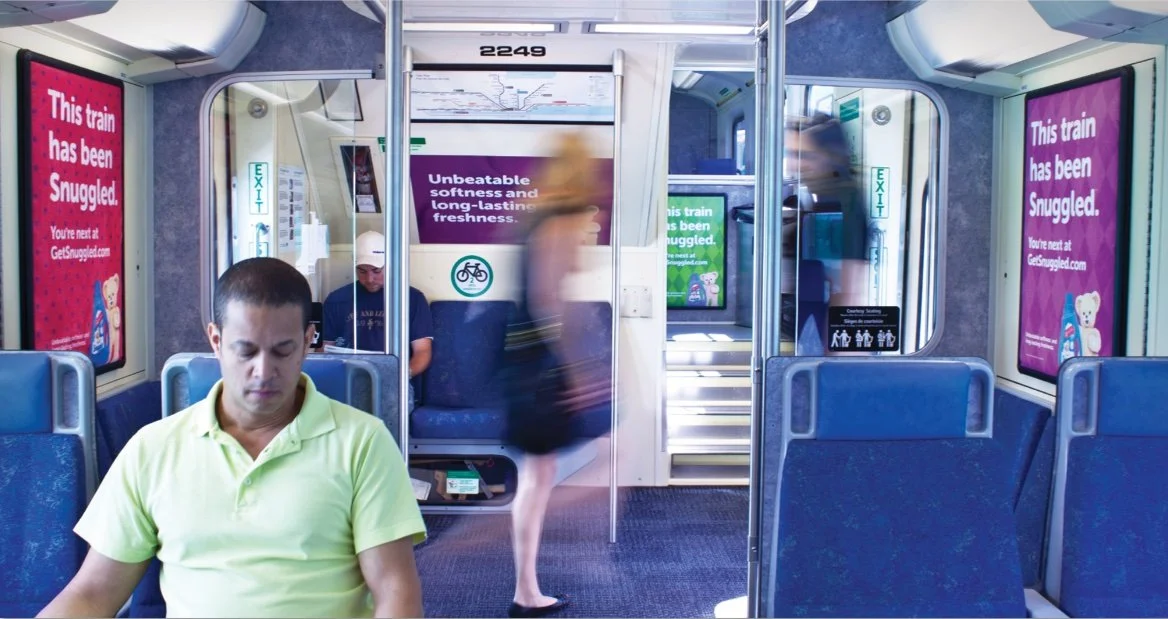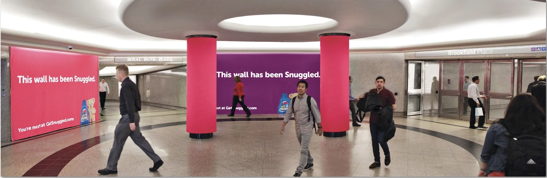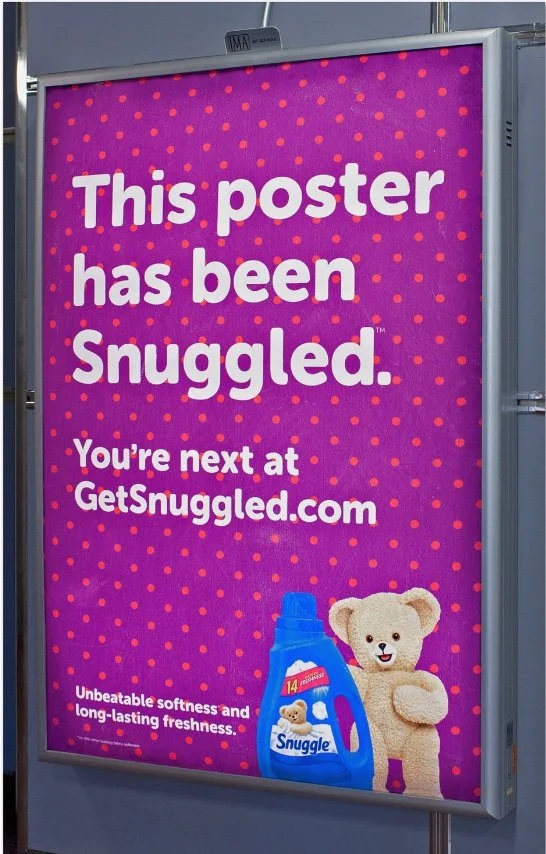 To demonstrate how soft Snuggle Fabric Softener makes your laundry, we printed our ads on soft, fleecy fabric, then washed them using the product. They were installed in places where people could not only touch and smell them, but where they could really use a little softness in their day, like in the downtown path, malls, and on commuter trains.