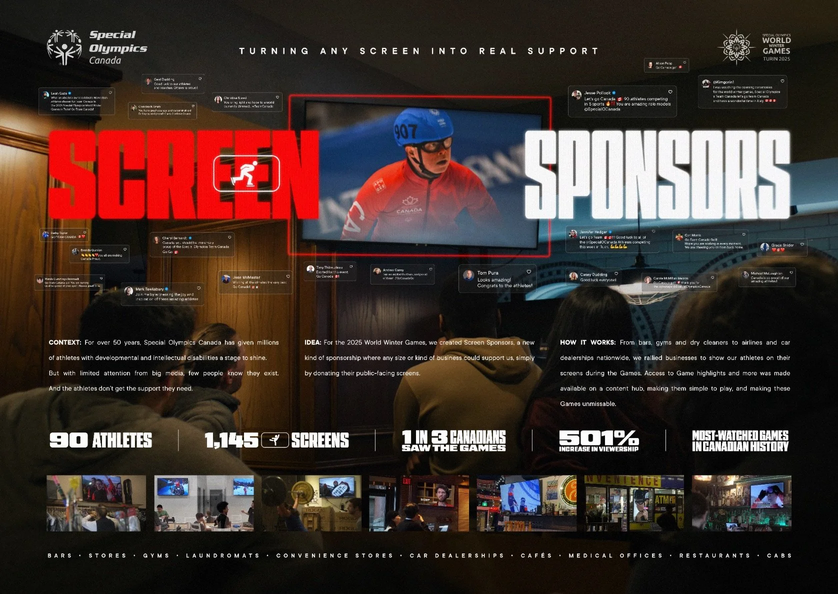 With limited attention from big media, many people didn’t know about the 2025 Special Olympics World Winter Games. So we created a new kind of sponsorship where any size business could support us, simply by donating their public-facing screens. With their help, we made these games unmissable, and received a Shortlist at Cannes 2025 to boot.
